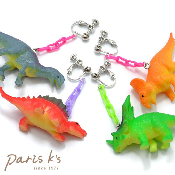 ポップな片耳用イヤリング サイズ チェーンの長さ:約20mm恐竜の大きさ:約50mm〜70mm×20mm〜40mm 注意 ・お客様側で恐竜の種類やお色はお選び頂けません。